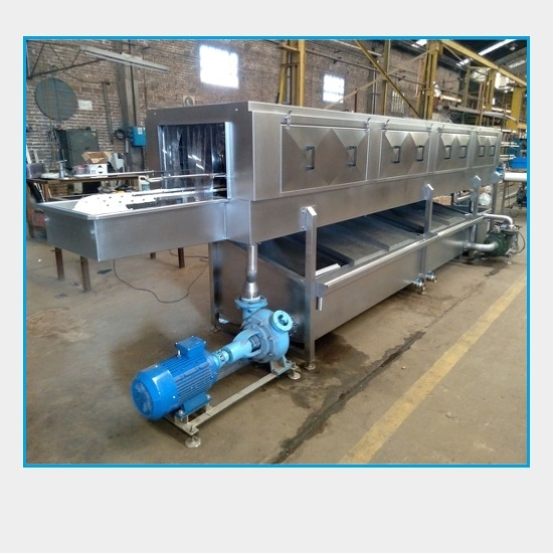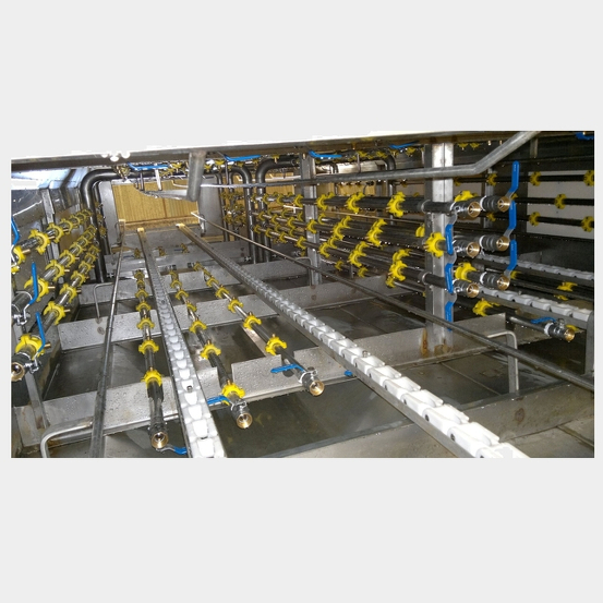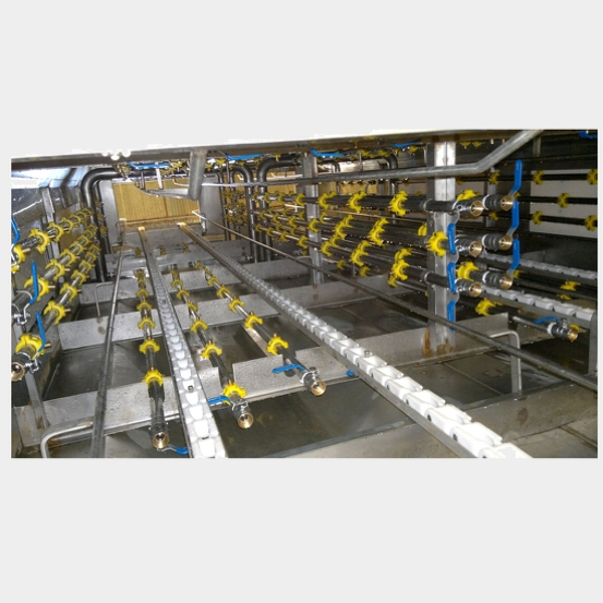 Las jaulas son transportadas a través del túnel de lavado por medio de una cadena transportadora, atravesando cuatro etapas de lavado provistas de picos aspersores de bronce de posicionamiento regulable distribuidos en todo el perímetro.